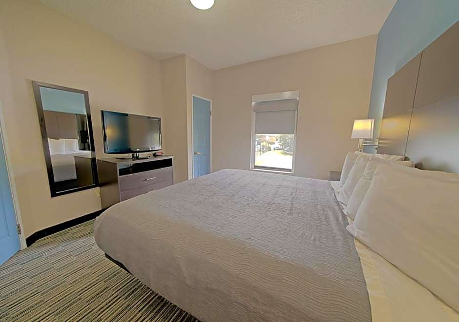 This suite has a separate living area with a sofa bed and TV. A kitchenette with a microwave, refrigerator, stovetop, and dishwasher is also included.